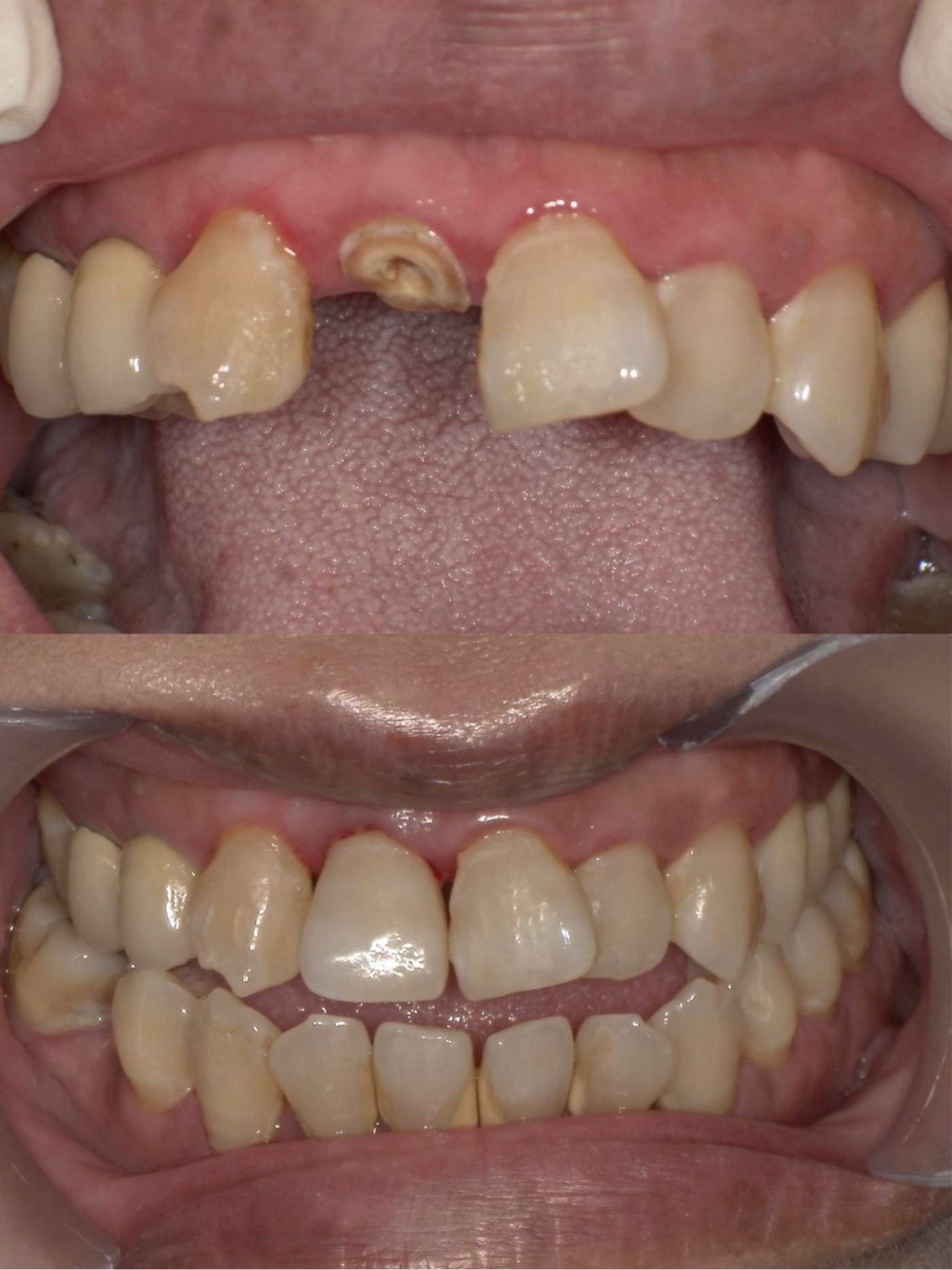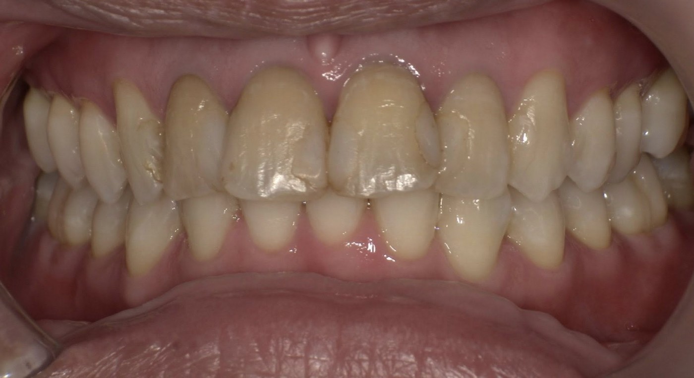 Case 2 的病患四顆牙都曾做了根管治療,但一直沒有做上假牙。看術前照片可以發現幾個問題:牙齒變色、二次蛀牙、填補物色差,此外牙齒型態略顯不對稱,排列上有些外暴,也缺乏自然的微笑線弧度。